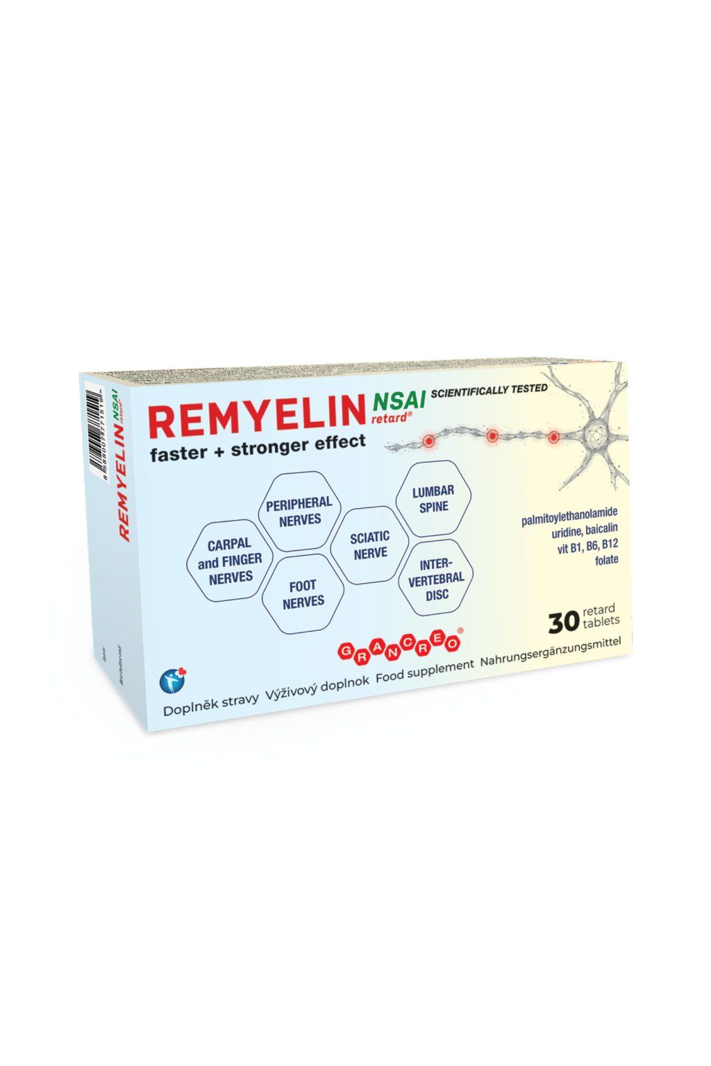 REMYELIN NSAI има подобрен състав, който осигурява хранене на нервите и предотвратява образуването на широк спектър възпалителни вещества. Освен това, благодарение на баикалина, е подходящ при неврологични пост-херпетични (след прекаран херпес) проблеми и лаймска болест, при които обикновено се увреждат периферните нерви.